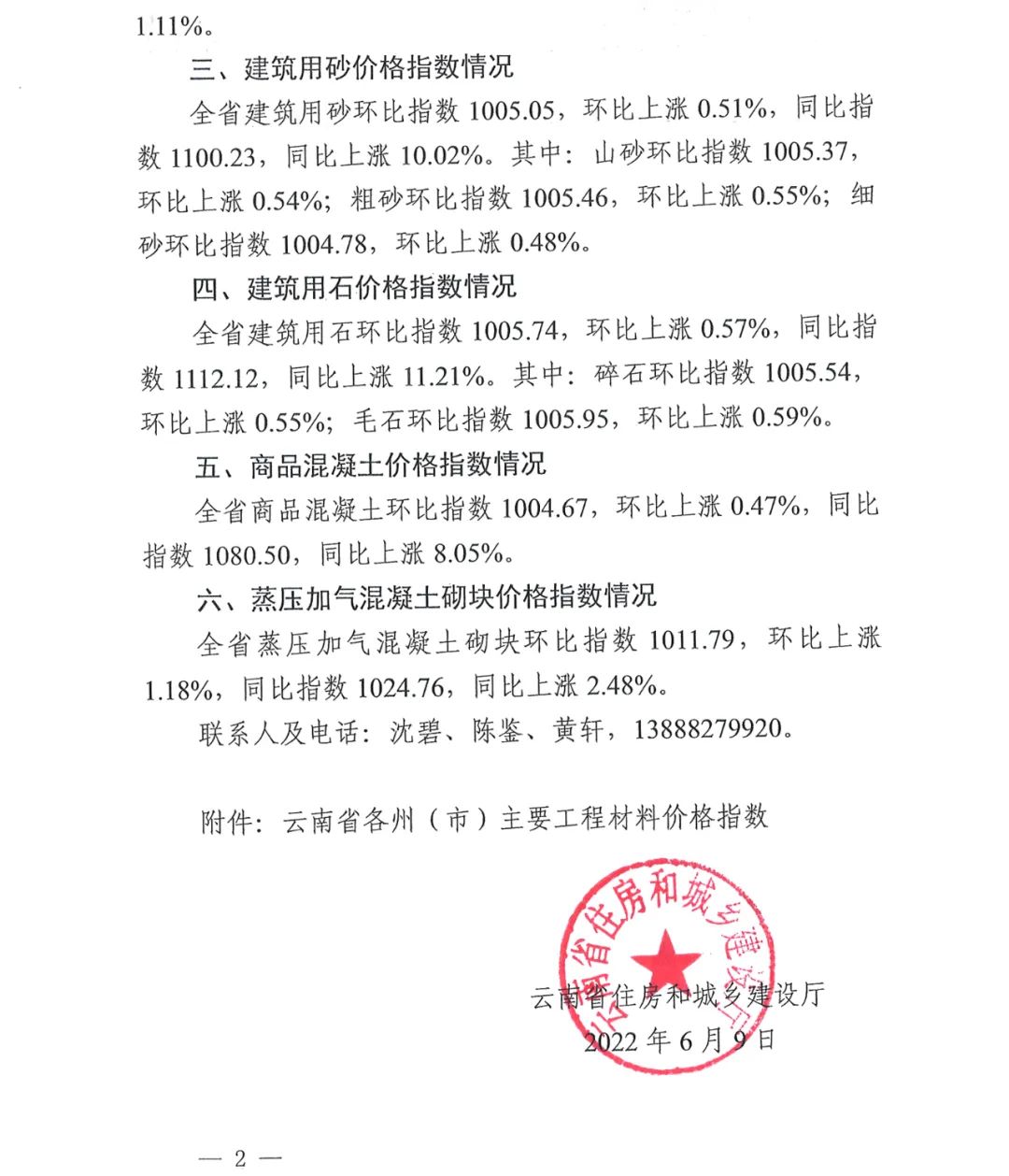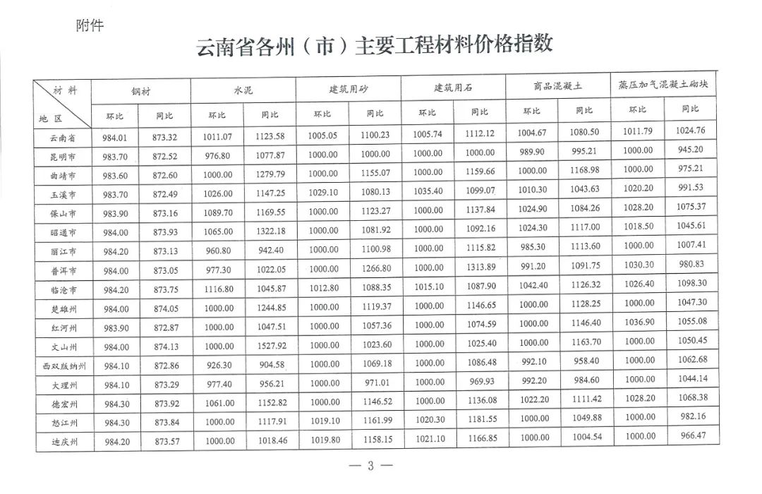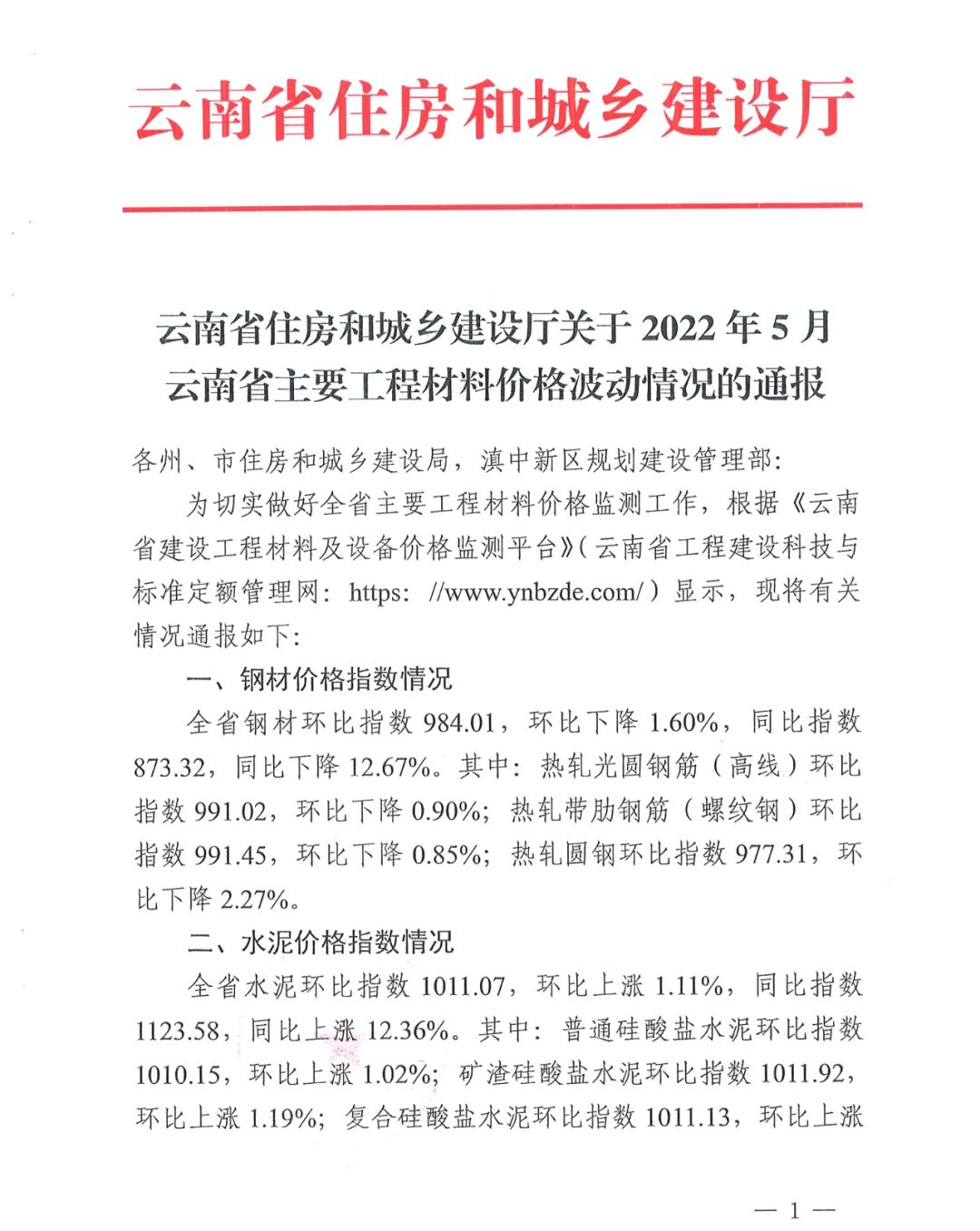 云南省住房和城鄉建設廳關于2022年5月云南省主要工程材料價格波動情況的通報