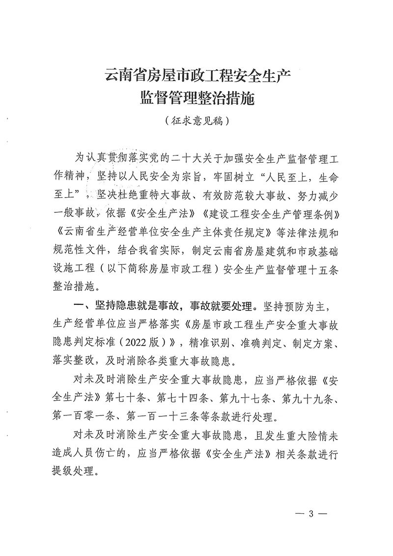 云南省住房和城鄉建設廳關于征求 《云南省房屋市政工程安全生產監督管理整治措施(征求意見稿)》意見建議