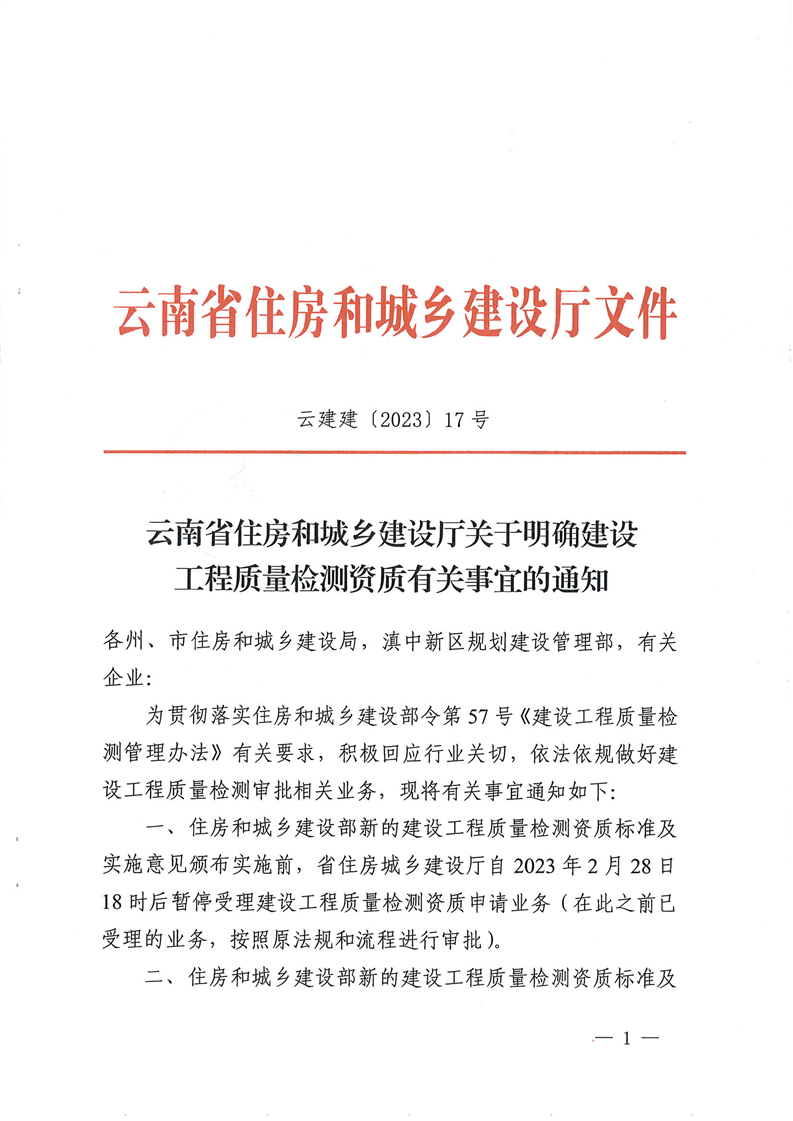 云南省住房和城鄉(xiāng)建設(shè)廳關(guān)于明確建設(shè)工程質(zhì)量檢測資質(zhì)有關(guān)事宜的通知