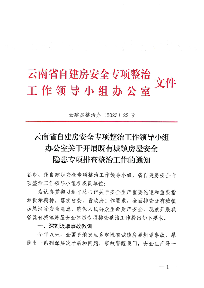 云南省自建房安全專項整治工作領導小組辦公室關于開展既有城鎮房屋安全隱患專項排查整治工作的通知